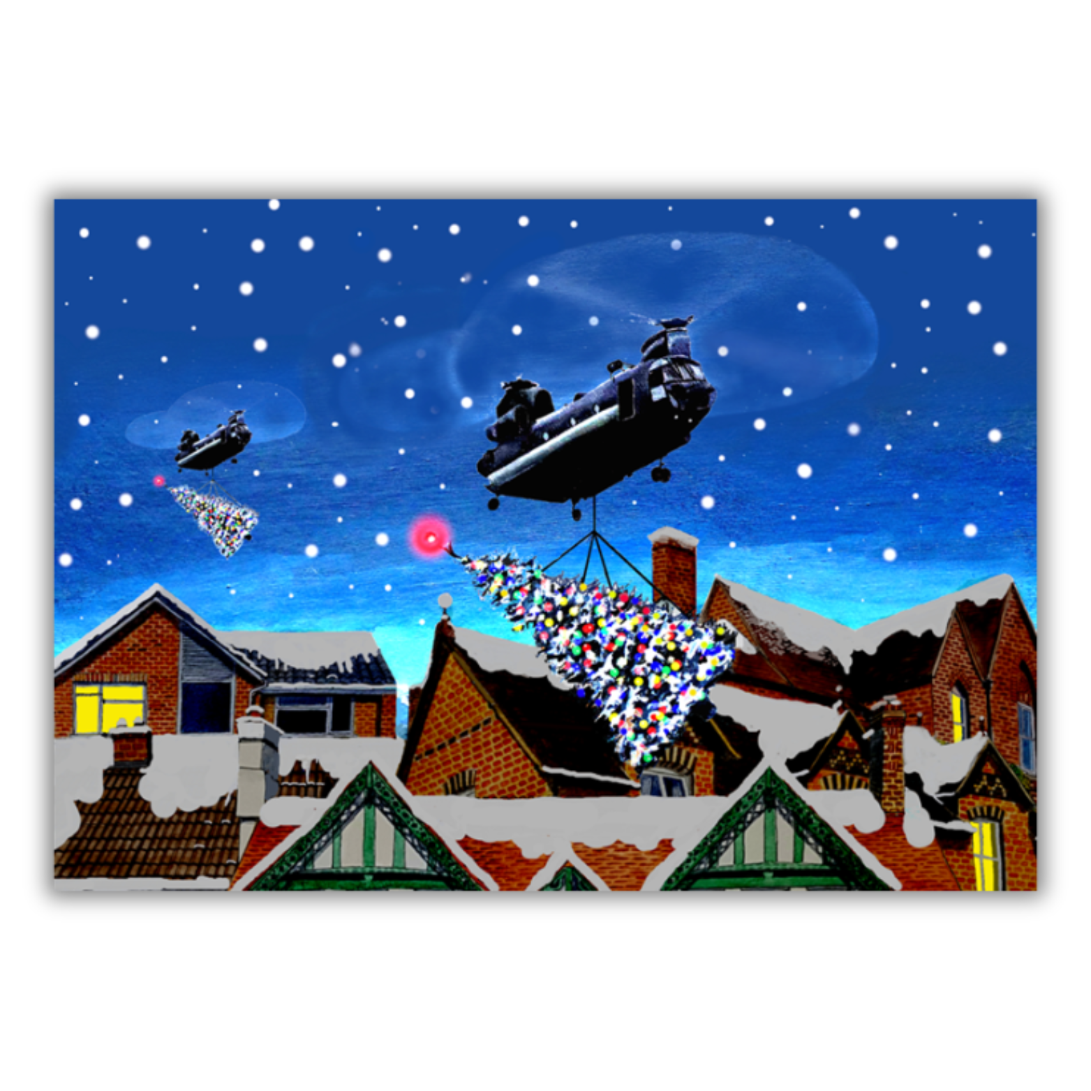 Kindly donated by an artistic supporter, these colourful cards depict a historic Chinook carrying a large Christmas tree over the British suburbs. It gives a whole new meaning to driving home for Christmas!