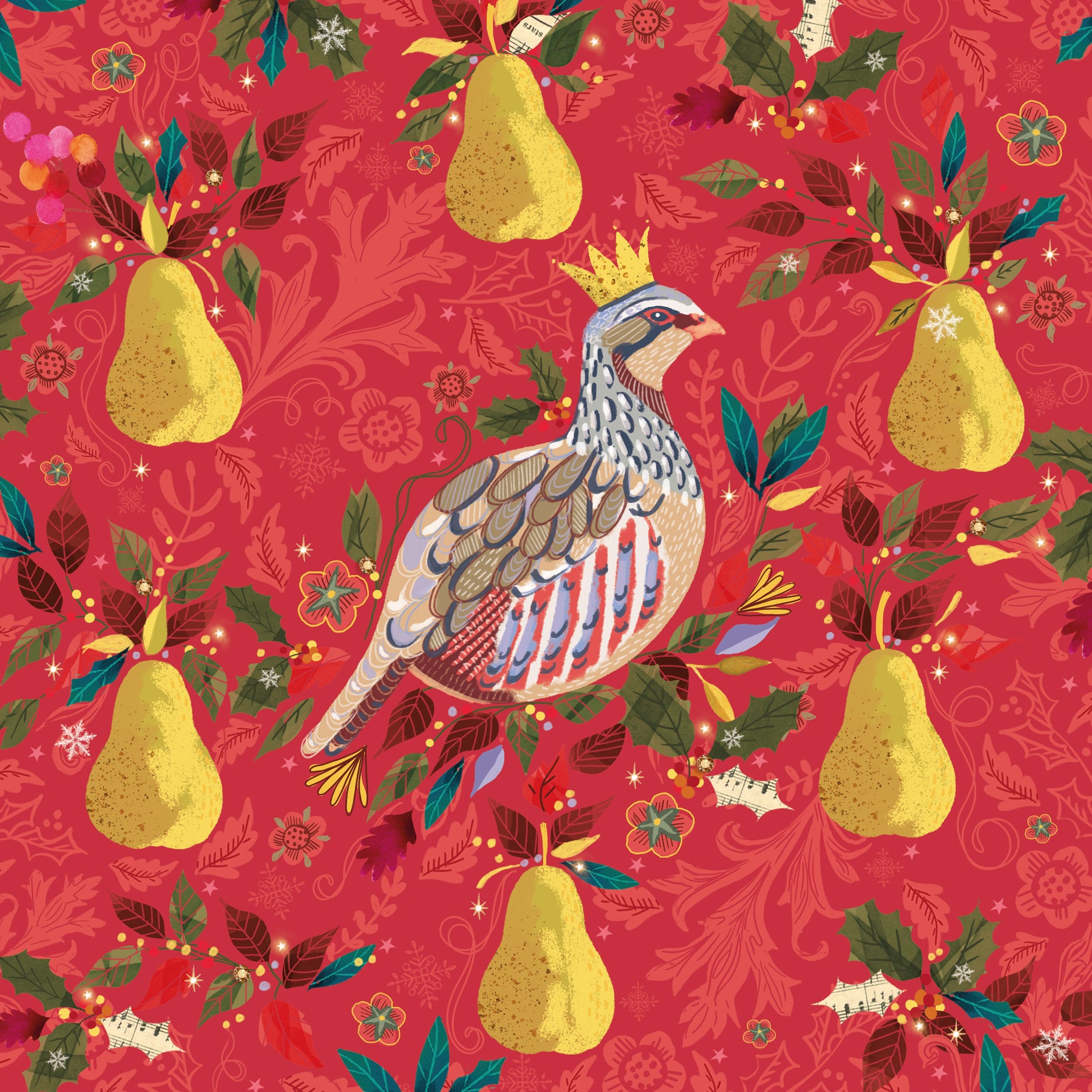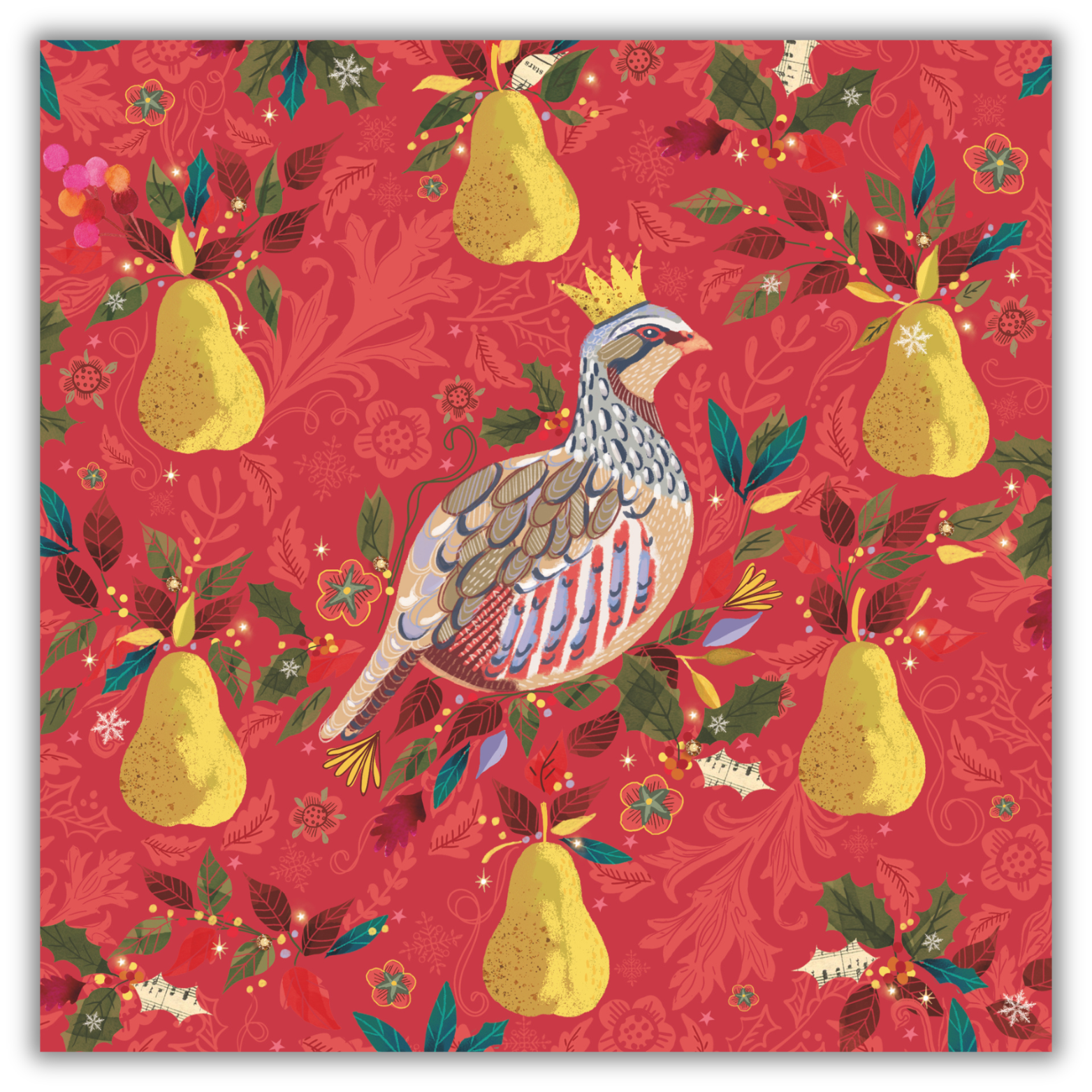 Enchant your loved ones with our elegant Golden Pears Christmas cards. Depicting an illustration of a regal partridge, surrounded by glorious plump pears, and set against a festive red background.