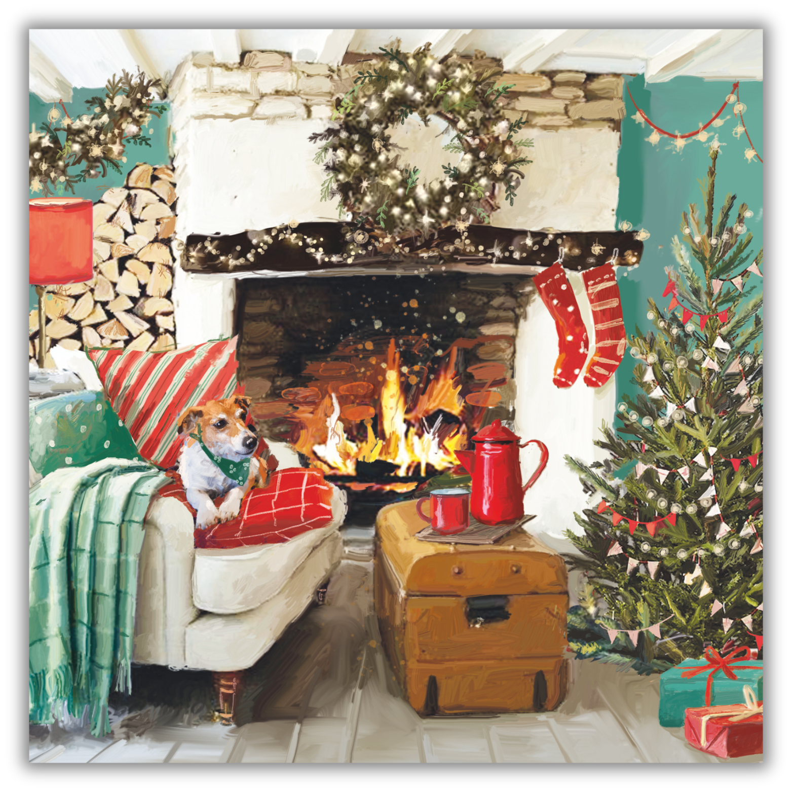 Embrace the warmth of the Christmas season with The Log Fire Christmas cards. Featuring a serene scene of a crackling log fire with man's best friend, a lovely dog, enjoying the heat as he rests on the sofa. The design features festive pops of bright RAF red.